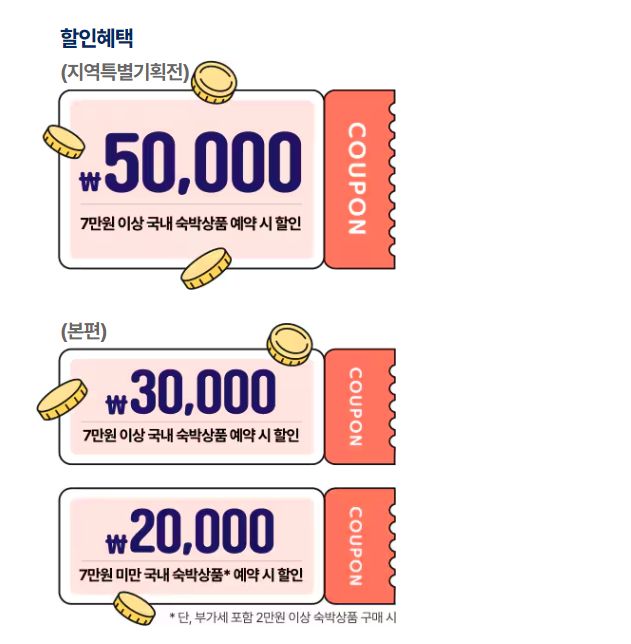 여기어때: 1만원 할인 야놀자: 1만원 할인 하나투어: 추가 할인 쿠폰 발급