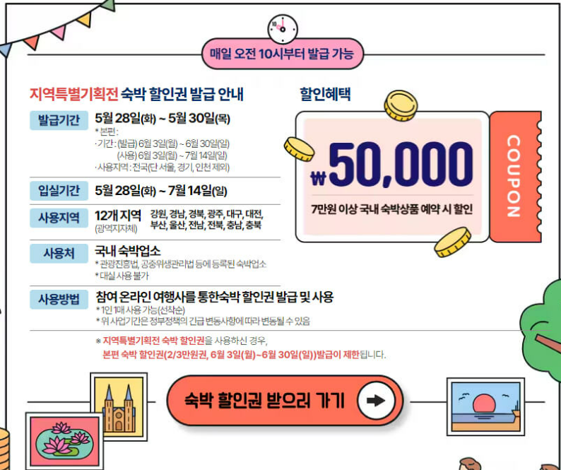 사용 기간: 2024년 5월 28일(화) - 2024년 7월 15일(일) 7만원 이상 국내 숙박 상품 예약 시 최대 50,000원 할인 가능합니다. 매일 오전 10시부터 선착순으로 발급됩니다.